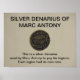 Foto de Antony, prata, de Marc Antony, com palavras que dizem que este é um dinário prateado usado por Marc Antony para pagar suas legiões. Cada legião tinha a sua própria moeda. Faz um impressão de nicho.