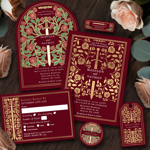Silver Red Medieval Sword Wedding RSVP