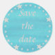 A pintura de um círculo de estrelas prateadas sobre um fundo de azuis luminosos misturados com Save the date, em prata, é impressa em adesivos.