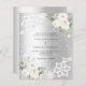 Para um casamento elegante e romântico. Um fundo de aparência pura prateada decorado com florais brancos, rosas, rendas brancas e diamantes falsos. Personalize e adicione seus nomes e detalhes. 1 folha = 1 convite impresso de borda a borda.