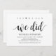 Sim, podemos, fizemos, cartões de convite de recepção de casamento elopement.Este cartão de convite de casamento rústico com tema de elopement é perfeito para a recepção do seu casamento e festa de celebração pós-casamento. Adicione seus detalhes em fonte / letra preta correspondente.