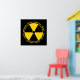 Símbolo de radiação amarelo e preto rodeado por "Perigo - Radiação" em texto amarelo repetitivo.