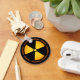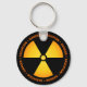 Símbolo de radiação laranja e negra chaveiro com "Perigo - Radiação" em caracteres de cor laranja repetida.