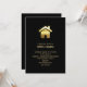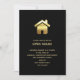 Convite à casa aberta com uma imagem simples de uma casa de gradiente dourado sobre fundo preto.