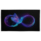 Símbolo luminoso, roxo e infinito com beija-flor azul voadora, luminosa, em fundo preto. Neon.