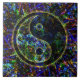 Símbolo urbano futuro metálico de yang do yin da paisagem sobre um fundo multi-hued abstrato metálico azulado fraturado cercado por um fulgor amarelo-branco.