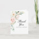 Cascata impermeável de rosas cor-de-rosa, verde e folhagem de eucalipto enfeite a esquerda deste cartões de agradecimentos fúnebre clássico. Obrigado Você está escrito em uma fonte de script clássica. Há uma mensagem de dentro com um arranjo floral adicional de rosa.