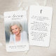 Keep the memory of your loved one close with this personalized prayer card featuring a beloved photo, the sentiment IN LOVING MEMORY, name and dates and an editable prayer you can change to another prayer, bible verse, heartfelt remembrance message or poem accented with a simple cross. With its simple yet elegant design and modern script typography on your choice of background color (shown in white), it makes a cherished keepsake to share at a funeral, memorial service, visitation, wake or Celebration of Life and offers comfort and a lasting tribute for family and friends. Its small and portable size of 3.5x2" (wallet-sized) makes it convenient for loved ones to carry it with them as a reminder of your loved one’s life and spirit.