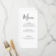 The large flowing “Menu” headline creates a beautiful focal point, while the structured sections for starter, main course, and dessert ensure guests can easily view the evening’s dining experience. Its balanced spacing and simple elegance make it an ideal complement to modern, classic, and formal wedding décor.