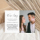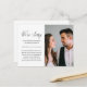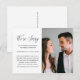 Este simples aviso de adiamento de casamento em preto e branco é uma maneira doce de informar aos convidados que a cerimônia foi adiada devido a eventos imprevistos. O anúncio apresenta uma foto do casal e uma caligrafia com o dizer "sentimos muito". As informações do seu endereço de retorno estão incluídas no verso do cartão-postal.