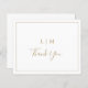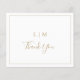 Simples cartões de agradecimentos de casamento orçamentário com um design moderno, mas elegante, com seu monograma de duas letras junto com "obrigado você" em uma letra manuscrita cercada por uma fina borda. O verso tem sua mensagem personalizada. Todos os elementos de design estão em ouro falso e podem ser alterados para qualquer cor desejada na ferramenta de edição de design. Um design chic e na moda que é excelente para um casal minimalista.