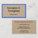 Este simples design de cartão de visita apresenta um nome, profissão e informações de contato que podem ser personalizadas. Ele também apresenta uma borda azul. Cartões de visitas como esses podem ser usados por um profissional como consultor, médico ou gerente.