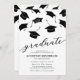 Convites de festa de formatura minimalistas com bonés preto em queda, e um modelo de texto moderno que é fácil de personalizar.