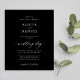 Elegante e simples e magra barato de orçamento negro convite de casamento preto com modelo de um clássico roteiro de caligrafia na moda. +++++++++++++++++++++++ Fácil de personalizar com seus detalhes! O convite é adequado para casamentos formais de gravatas negras. ++++++++++++++++ NOTA que a cor de fundo pode ser alterada para corresponder ao esquema de cor do casamento. Se for confortável, você pode alterá-lo depois de selecionar a opção PERSONALIZAR TI. +++++++++ LEIA ISTO ANTES DE COMPRAR! Este é um cartão de casamento de barato orçamentário impresso em uma folha de papel (cada folha tem um cartão). +++ Para obter a melhor qualidade de preço, nosso conselho é escolher o tipo de papel Semi-Gloss (é espesso o suficiente para ser usado para papelaria) +++ Se você precisar de envelopes, escolha a OPÇÃO ENVELOPE. ++ Verifique duas vezes todas as informações e a ortografia do seu texto porque você receberá exatamente o que você vê - ninguém mais verificará nada antes de imprimir. +++ Esta placa foi projetada para o tamanho de 4,5" x 5,6". Caso você escolha outro tamanho do cartão e o texto saia da página, tudo precisa ser corrigido antes de adicionar o produto ao carrinho. Peça ajuda ao Serviço de Design ao Vivo.