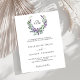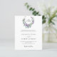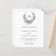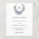 Fundo branco. Uma coroa floral feita de flores lavandas e de eucalipto verde de cor aquosa. Personalize e adicione suas iniciais, nomes e detalhes do monograma. Texto preto. 1 folha = 1 convite impresso de borda a borda.