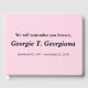 Este livro de condolências funerárias/memorial básico apresenta a mensagem "Nós nos lembraremos de você para sempre", e o nome personalizado e as datas de nascimento/morte do indivíduo que faleceu. Poderia ser usado para registrar desejos simpáticos aos familiares e amigos de alguém que morreu recentemente. O texto é preto e a cor de fundo é rosa claro.