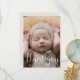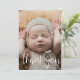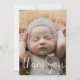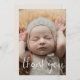 Envie um obrigado especial a sua família e amigos com este cartão com fotos de anúncio de nascimento O simples design apresenta uma foto na frente com Obrigado em uma tipografia de script O verso inclui todos os detalhes importantes, incluindo nome do bebê, data de nascimento, estatísticas de natalidade e uma mensagem de obrigados dos pais.