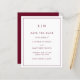 Um simples orçamento de burgundy salve a data com um design moderno, mas elegante, com seu monograma de duas letras no topo e seus detalhes de casamento cercados por uma fina fronteira. Um design chic e na moda que é excelente para um casal minimalista.