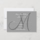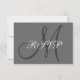 Um simples e moderno design de cartão de resposta RSVP de casamento com o inicial do seu último nome em cores cinza e branco, torna este um RSVP de casamento simples versátil porque a sua inicial criará seu próprio design único com a sua escolha de cores para o texto e o fundo. Design por Elke Clarke 2008. Personalize com o seu monograma e cores de casamento. Adicione todo o seu texto de RSVP de casamento no verso do cartão usando os prompts de menu fáceis de usar da Zazzle. Vem com envelope branco em branco. Para acessórios correspondentes, veja os links abaixo.