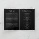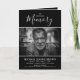 Personalize este programa de funeral simples e moderno com sua própria foto e texto para criar um tributo especial ao seu amado. Um programa 'In Loving Memory' com fundo preto tradicional com tipografia branca. No cobrir da frente, uma foto do seu amado, seu nome, datas, o local do memorial e a data do evento. No dentro é um obituário e uma ordem de serviço; e no verso você tem a opção de adicionar mais duas fotos, uma nota de agradecimento e o local do acordar. O texto é uma combinação de script de caligrafia manuscrito e fonte de serifa de curvatura. Todo texto é facilmente editável. Se precisar de ajuda para personalizar isto, por favor, envie-me uma mensagem usando o botão abaixo e eu ficarei feliz em ajudar.