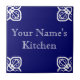 Sinal de cozinha. Branco sobre azulejo espanhol azul.