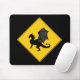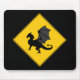 Cuidado! Condições perigosas à frente. A fantasia encontra a realidade. Dragão Cruzando. Sinal engraçado feito no estilo de uma placa de estrada.