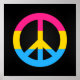Poster com o símbolo de paz design a em cores com a bandeira do orgulho de pansexualidade; bandeira do orgulho de listras rosa, amarela e azul sobre fundo preto