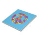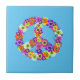 Um sinal de paz floral de tons cor-de-rosa, turquesa, amarelo, laranja, roxo, verde e preto.