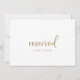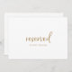 Este guião rústico de ouro reservado é perfeito para um casamento no campo. A placa tem dois lados (impressões em ambos os lados). O simples e moderno design de ouro e branco apresenta uma única caligrafia manuscrita branca com estilo de boho minimalista contemporâneo. Personalizável em qualquer cor. Mantenha o design mínimo e simplista, como está, ou personalize-o adicionando seus próprios gráficos e trabalhos de arte. Use estes cartões para reservar cadeiras ou mesas na cerimônia de casamento, recepção ou qualquer evento.