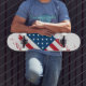 skate mostrado em um dourado impressão gráfico USA Flag. Comprar como está ou personalize este item de acordo com o seu gosto.