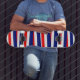 skate mostrado em uma impressão de gráfico de fita patriótica. Cor Vermelho, Branco, Comprar Azul como está ou personalize este item de acordo com o seu gosto. Imagem do stock
