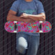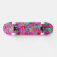 skate mostrado em um impressão gráfico de palmas tropicais multicolorido, cor-de-rosa quente. Cor Azul, Rosa Quente, Comprar Laranja como está ou personalize este item de acordo com o seu gosto. Imagem do stock