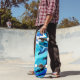 O skate é mostrado em um impressão abstrato azul multicolorido. Comprar como está ou personalize este item de acordo com o seu gosto. Impressão de ações freepik.com