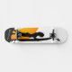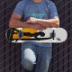 o skate da praia do por do sol da menina do surfista mostra um surfista da menina com a prancha no preto da silhueta contra um por do sol de incandescência bonito do amarelo alaranjado. Faz um grande conselho de exposição ou adicionam caminhões e rodas para um skate ideal dos patinadores completos.