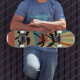 Este skate caracteriza um por do sol abstrato do seascape com palmeiras e uma tartaruga de mar.