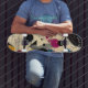 Este baralho geométrico de skate apresenta formas ousadas e linhas energéticas, apresentando uma paleta impressionante de preto, magenta, mostarda e coleira num pano de fundo creme. Perfeito para skatistas que amam a arte ou como um presente único, este design combina a arte contemporânea com energia vibrante, fazer-a como uma peça sobressalente para skate e exibição. A composição dinâmica e os elementos texturizados criam uma estética visualmente cativante e na moda.