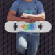 Água-viva grande, iridescente, desenhada artisticamente, brilhante, com longos tentáculos em branco, pintada sobre fundo de aquarela multicolorido. Água-viva arco-íris.