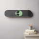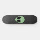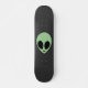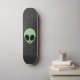 Cabeça de alienígena verde simples com grandes olhos pretos e uma pequena boca preta sobre fundo de cinza escuro.