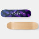 “Aloha”. Bring a bit of the Hawaiian islands to your city streets whenever you use this brightly colored, chic, striking, stylish, modern skateboard sporting crisp, white handwritten script typography over a distressed graphic, purple blue ombre pineapple pattern over a black background. Makes a fun and stylish statement every time you surf the pavement. Makes a great gift for a friend, or for yourself if you can’t bear to gift it away!