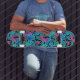 Blue and pink tropical leaves skateboard.
