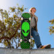 Este skate caracteriza um design verde de néon da cabeça da alienígena de espaço.