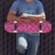 Apresentando trabalho de arte digital de brilhos em amarelo, rosa e verde com linhas cruzadas azul-brilho. O padrão se parece com cobras. Observe que esta é uma imagem digital, de modo que não há falhas reais no produto final.