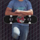 trabalho de arte decorativa de duas carpas koi monocromáticas circulando umas às outras num círculo vermelho num skate preto.