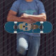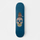 Este skate incrível apresenta um crânio de cinza assustador com olhos azuis brilhantes e dentes amarelos apodrecidos. Em cima do crânio está um rato marrom com orelhas cor-de-rosa, cauda, patas e nariz e olhos azuis. O rato tem um dorso arqueado pronto para saltar para você. Um design excelente para amantes de ratos e para o Halloween.