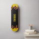 Este skate está pronto para ser personalizado com um nome ou uma mensagem personalizada. Ele apresenta as chamas do estilo de haste quente em um conjunto amarelo e vermelho sobre um fundo preto.
