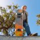 Esta é uma fotografia de um bombeiro pulverizando água num incêndio selvagem.