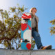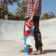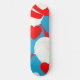 Gráficos cardíacos de estilo retrorativo em vermelho, branco e azul nos skateboards.