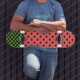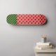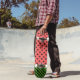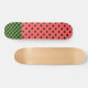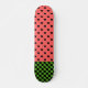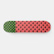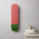 O deck de skate caprichoso apresenta um padrão de corações rosa e preto de melancia com uma borda inferior xadrez verde escuro.