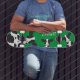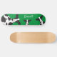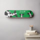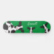 Um baralho de skate de nome personalizado com vacas ilustradas, negras e brancas, em fundo verde. Simplesmente personalize o nome, adicione-o ao seu carrinho e aproveite. Vaca Green Animal Name Skateboard Holidayday Design | ©Melissa Patton Artist/Illustrator