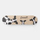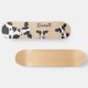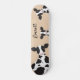 Um baralho de skate de nome personalizado com vacas ilustradas, negras e brancas, em fundo bronzeado. Simplesmente personalize o nome, adicione-o ao seu carrinho e aproveite.